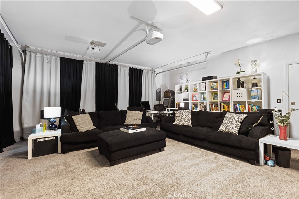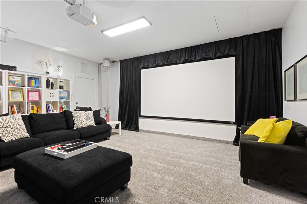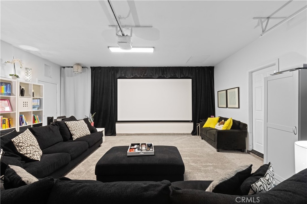 One garage has been converted into a state-of-the-art theater room for an immersive cinematic experience. There is additional driveway space for a boat or RV.