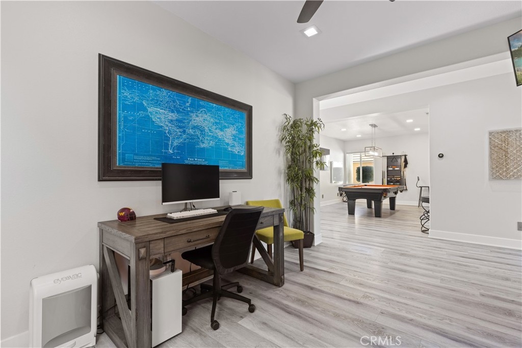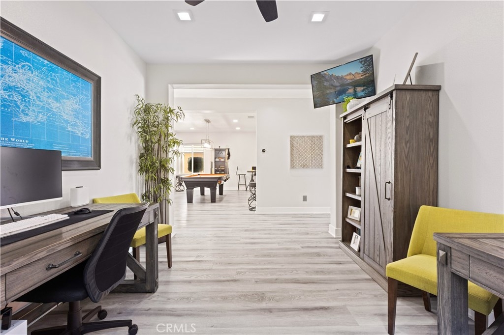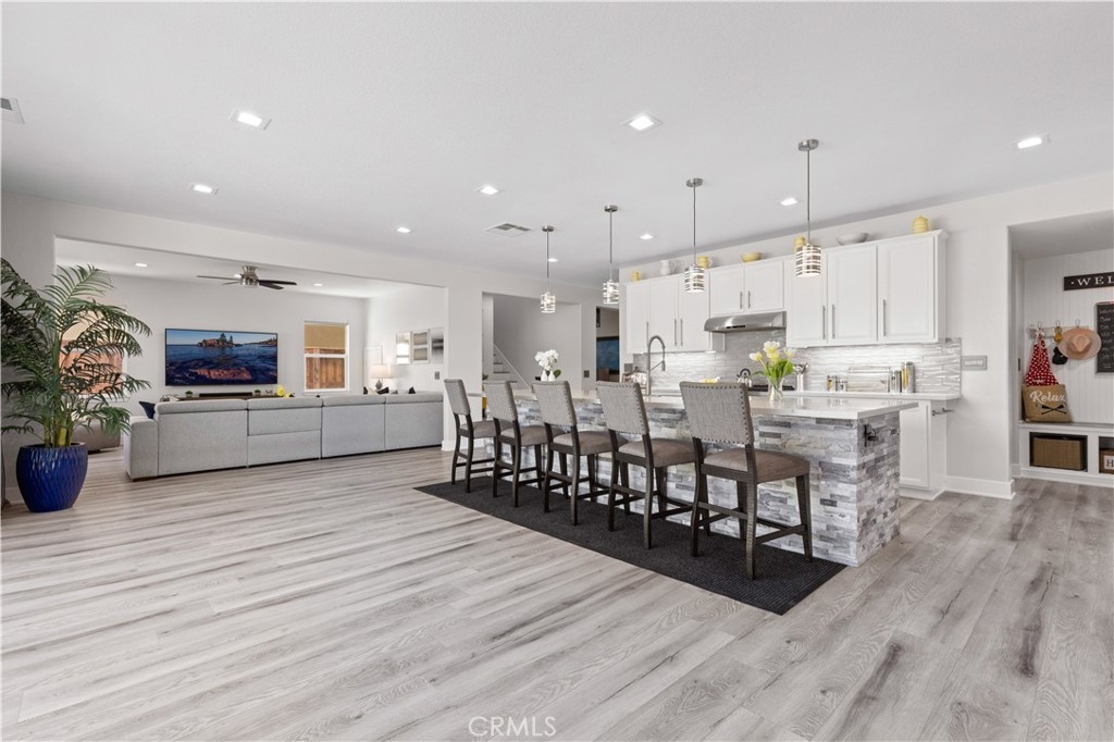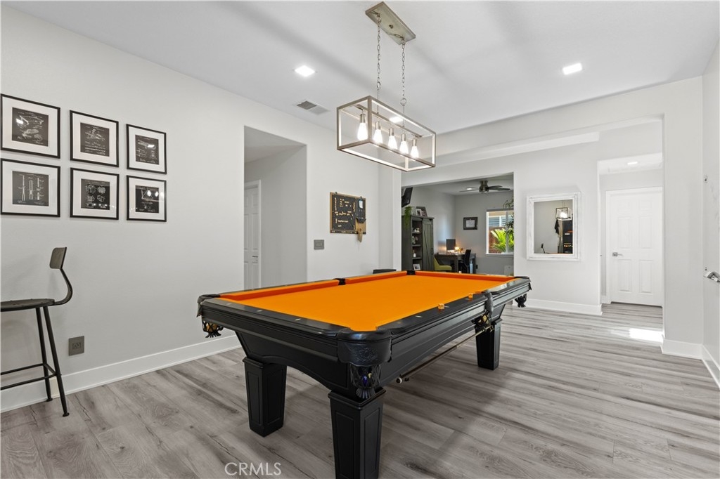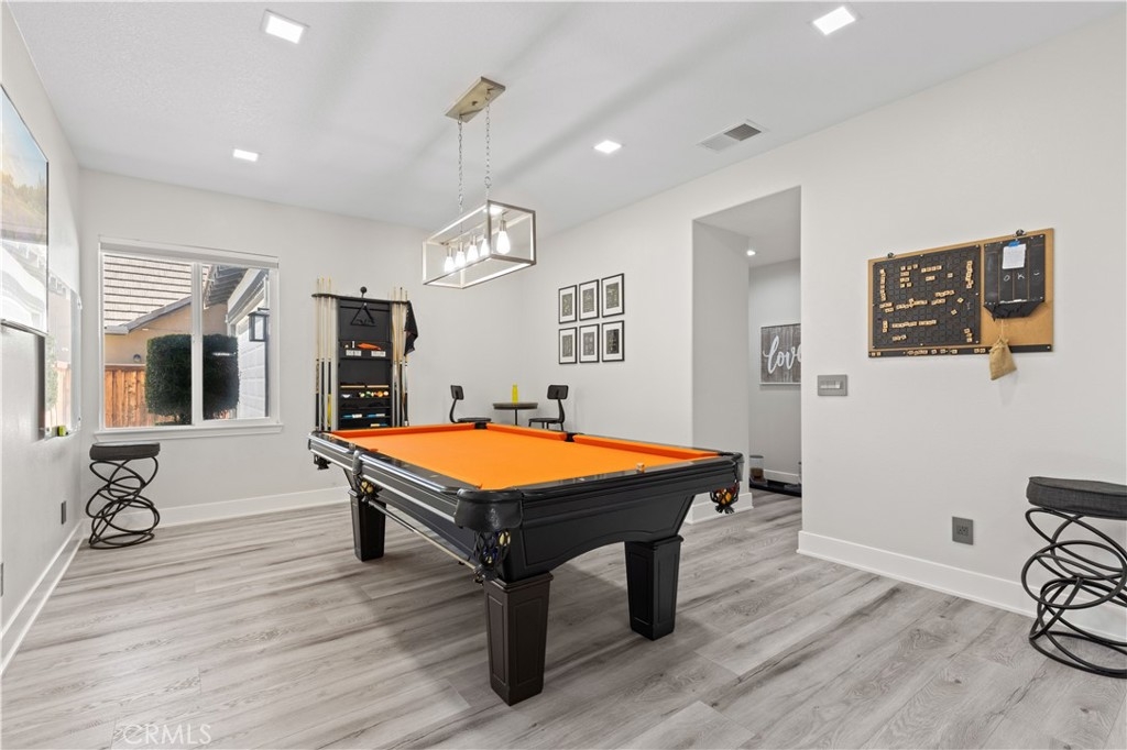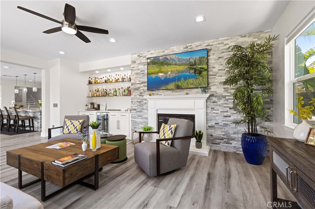 The grand living areas impress immediately. A formal dining room, currently used as a chic billiards space, is perfect for entertaining. The open design suits both lavish gatherings and intimate moments, with a spacious family room, chef’s kitchen, casual dining area, and a living room with a custom-built bar and elegant fireplace. Stone accents further elevate the ambiance.